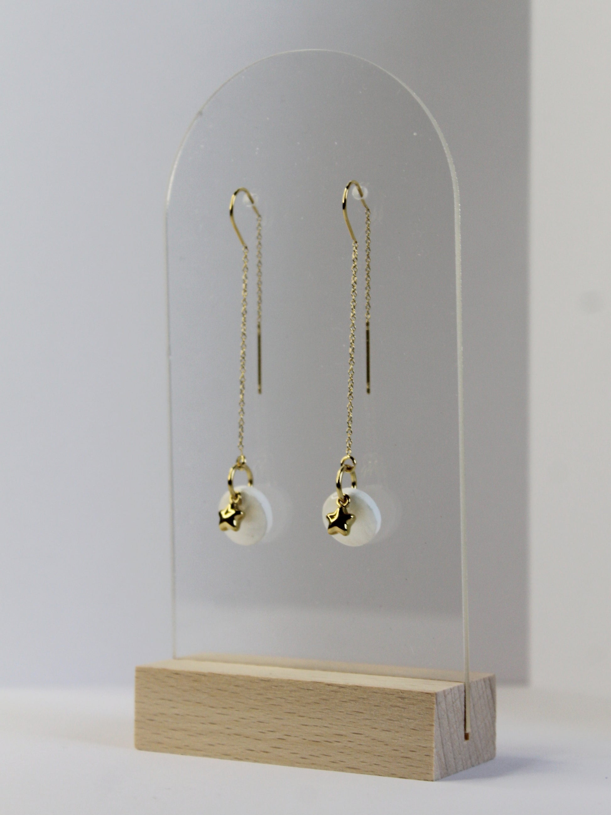 Ces boucles d'oreilles longues en acier inoxydable doré sont parfaites pour illuminer vos tenues. Elles arborent une petite étoile en acier inoxydable doré, rehaussée par un fond en pâte Fimo blanche nacré. L'acier inoxydable assure durabilité et éclat, tandis que la pâte Fimo ajoute de la couleur. Légères et confortables, elles apporteront une touche d'originalité et de sophistication à votre look, vous faisant briller en toute occasion.